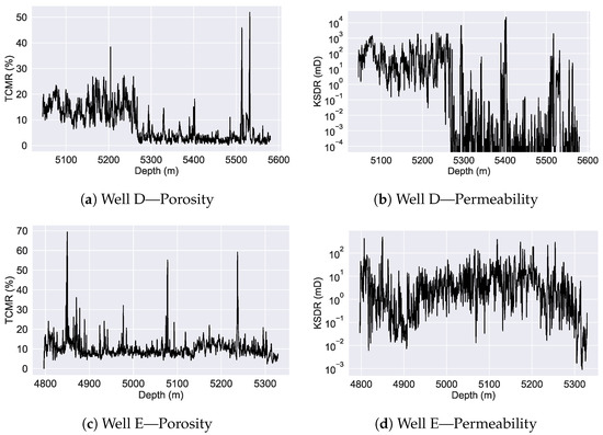 The other two wells, Well D and Well E, provide porosity logs represented as TCMR (Total Nuclear Magnetic Resonance (NMR) porosity, in %) profiling. These logs also include petrophysical porosity () values. Additionally, permeability logs () are derived using the SDR (Schlumberger–Doll Research) [49] model applied to NMR data, along with petrophysical absolute permeability (). Since both wells are located within the same basin, this enables a localized comparison, as illustrated in Figure 9.