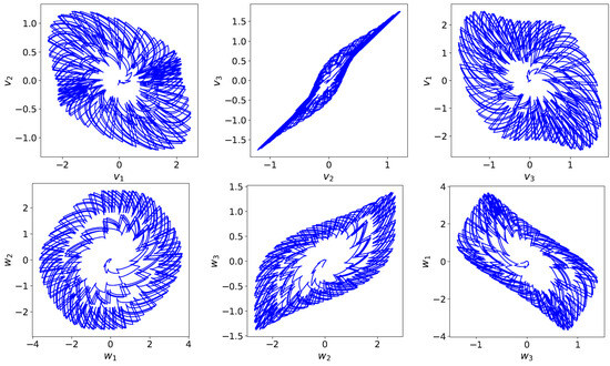 The initial conditions are , , and . The results presented in Figure 1 and Figure 2, along with the corresponding Lyapunov exponents calculated using the method outlined in Section 2.3 are and , , . Therefore, the system (24) exhibits a chaotic attractor.