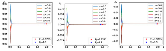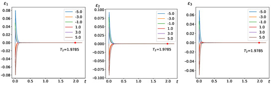 As mentioned in the introduction section, there are cases where it is necessary to set the synchronization time in advance. Theorem 2 provided the necessary conditions for PDT synchronization. Now, we validate these conditions numerically, taking into account the PDT synchronization of drive–response systems (24) and (25). All parameters are as previously delineated in the FXT synchronization context. Set the preassigned-time as ; then,