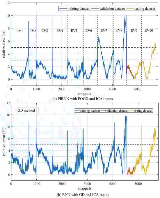 - The proposed PIRNN can learn the battery information of running EVs during training convergence and achieve stable capacity estimation accuracy (relative error < 3%) using a LiFeP battery dataset over three-quarters of a lifetime. This demonstrates that the proposed PIRNN can be applied to realistic batteries from running EVs and hold its accuracy.
