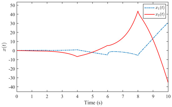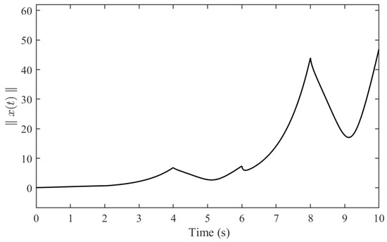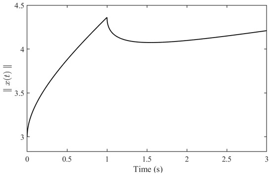From Figure 1, it can be verified that does not exceed the given value over 0–2.2772 s, which is to say that the system (65) is finite-time stable with respect to , where , which demonstrates the effectiveness of Theorem 2.