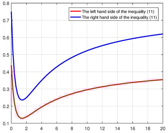 Figure 1 shows the relationship between the left-hand and right-hand sides of inequality (11) for the selected parameters. The difference between the two sides represents the bounds established by the inequality, confirming their agreement and consistency over the range . This validates the correctness of the theoretical findings under the specified conditions.