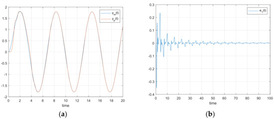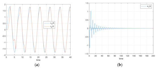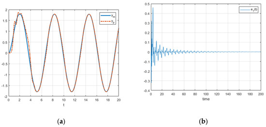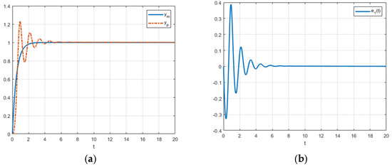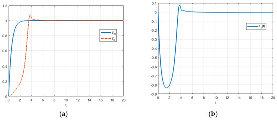 Figure 11 shows similar behavior as Examples 1 and 2; that is, the plant output converges to the model reference output , which is equivalent to saying that the control error tends to 0 as . Also, from Figure 12, we confirm that , even if in some time intervals (mainly in the transient period), can be positive.