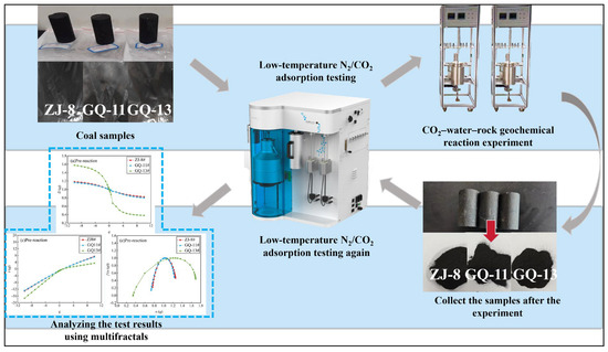 Initially, coal samples from three seams were fashioned into cylindrical specimens measuring Φ2.5 cm × 5 cm and ground into powder with particle sizes ranging from 60 to 80 mesh. These powdered samples underwent low-temperature N2/CO2 adsorption–desorption analyses to ascertain the initial pore characteristics. Concurrently, the cylindrical samples were placed in a high-temperature, high-pressure reactor for ScCO2–water–rock interaction experiments. After the reaction, the cylindrical specimens were retrieved, reground to a particle size range of 60–80 mesh, and retested with low-temperature N2/CO2 sorption to determine the subsequent pore characteristics. Ultimately, multifractal theory was employed to evaluate the pore characteristics derived from N2/CO2 sorption tests conducted before and after the reaction, revealing the heterogeneity of the sample pores (Figure 1).