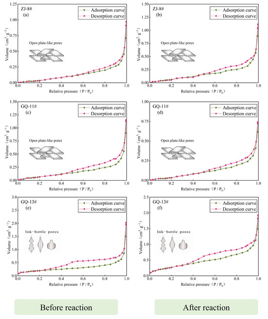 Low-temperature N2 sorption isotherms of the samples before and after the ScCO2–water–rock reaction. (a) presents the low-temperature nitrogen adsorption isotherm of the ZJ-8# sample before the SCCO2—water—rock reaction, (b) shows the isotherm after the reaction, (c) displays the isotherm of the GQ-11# sample before the reaction, (d) illustrates the isotherm after the reaction, (e) provides the isotherm of the GQ-13# sample before the reaction, and (f) depicts the isotherm after the reaction.