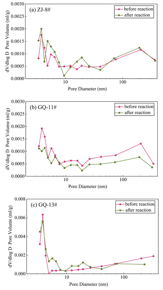 PSD of the samples from low-temperature N2 testing before and after the ScCO2–water–rock reaction. (a) presents the PSD of the samples from low-temperature N2 testing before and after the ScCO2–water–rock reaction of sample ZJ-8#; (b) presents the PSD of the samples from low-temperature N2 testing before and after the ScCO2–water–rock reaction of sample GQ-11#; (c) presents the PSD of the samples from low-temperature N2 testing before and after the ScCO2–water–rock reaction of sample GQ-13#.