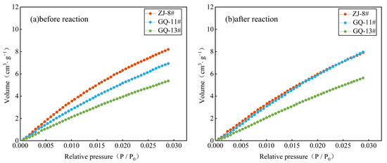 Isothermal adsorption lines from low-temperature CO2 testing before and after the ScCO2–water–rock reaction. (a) presents the isothermal adsorption lines from low-temperature CO2 testing before the ScCO2–water–rock reaction; (b) presents the isothermal adsorption lines from low-temperature CO2 testing after the ScCO2–water–rock reaction.