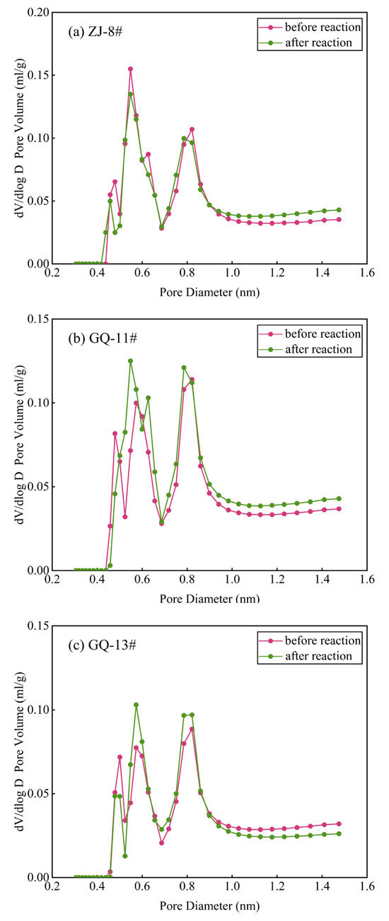 The low-temperature N2 sorption test primarily serves to characterize mesopores, but it faces challenges in accurately representing the structural attributes of pores that fall outside the mesopore size range. In contrast, low-temperature CO2 testing is preferably suited for pores less than 2 nm in diameter, providing an additional methodological perspective to N2 sorption for a thorough evaluation of coal pore architecture. Table 4 presents the micropore structure parameters of three samples before and after the reaction. Following the ScCO2–water–rock interaction, the specific surface area of the ZJ-8# sample decreased from 85.125 m2/g to 83.01 m2/g, while the pore volume remained essentially unchanged. The average pore diameter shrank from 0.573 nm to 0.548 nm. The specific surface area of the GQ-11# sample increased from 73.793 m2/g to 83.755 m2/g, and the micropore volume rose from 0.027 cm3/g to 0.031 cm3/g, with the average pore diameter expanding from 0.501 nm to 0.573 nm. For the GQ-13# sample, the specific surface area slightly increased from 57.728 m2/g to 58.506 m2/g, with no significant changes observed in the micropore volume or the average pore diameter before and after the reaction.