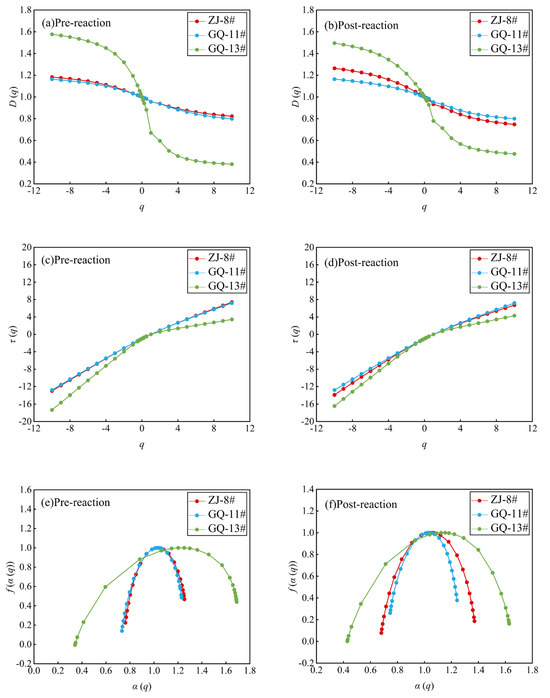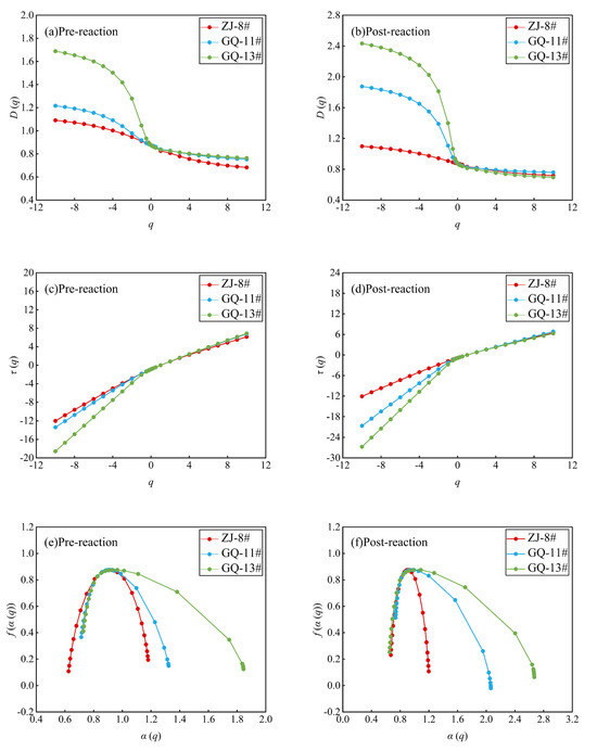 Figure 6a,b display the correlation between the multifractal dimension Dq and the matrix order q for the PSD before and after the reaction. The Dq-q spectrum of the samples exhibits a consistently monotonic decrease, resembling an inverted ‘S’ shape, with a steep drop in Dq for q < 0 and a moderated decline for q > 0 before and after the reaction. A closer examination shows an increase in the ZJ-8# sample’s spectrum width after the reaction, suggesting increased heterogeneity, and a decrease in the GQ-13# sample’s width, suggesting reduced heterogeneity. The GQ-11# sample’s spectrum width showed no significant change before and after the reaction.