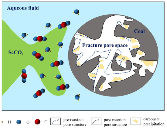 In summary, the ScCO2–water–rock reaction exerts a dual effect of precipitation and dissolution on the pores of coal reservoirs. It not only results in the enlargement of existing pores or the formation of new fractures but also leads to the precipitation of carbonates, which can obstruct the original pores. Furthermore, the outcomes of multifractal analysis provide additional insights, indicating that the ScCO2–water–rock reactions occur heterogeneously within the pores (Figure 8).