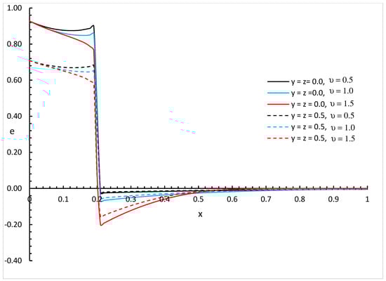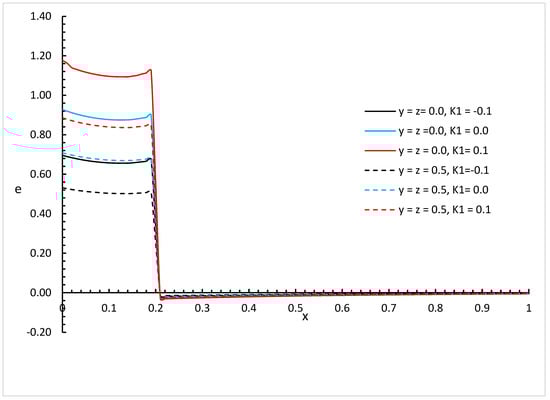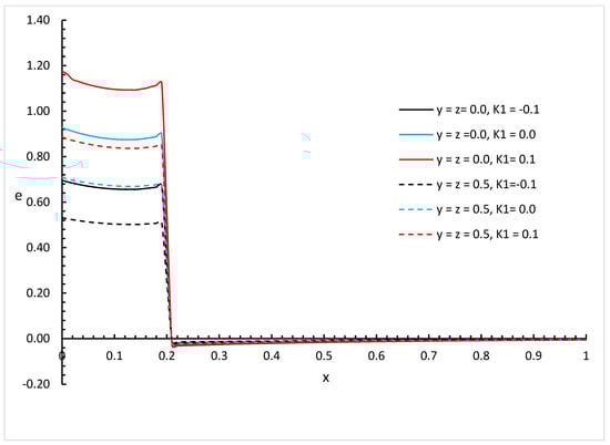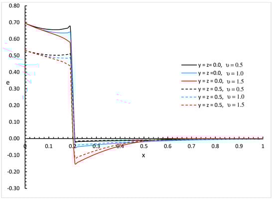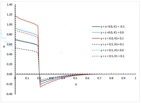 Figure 14, Figure 15, Figure 16, Figure 17, Figure 18 and Figure 19 show the differences between the three cases of thermal conductivity where the behaviours of the invariant strain distribution for the weak, normal, and strong thermal conductivity are different. We can see that the distributions of the invariant strain fall to zero at a smaller distance from the bounding surface in the order of strong thermal conductivity, followed by normal thermal conductivity, and then weak thermal conductivity.