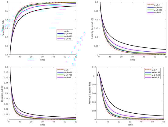 (antivirus-capable) under varying fractional orders () using the Atangana–Baleanu operator. These plots reveal how fractional-order parameters influence the evolution of each compartment, demonstrating, for instance, that higher fractional orders () correspond to more pronounced changes in the dynamics, while lower orders () exhibit slower transitions, capturing memory effects inherent in the system. Figure 2 provides time-series simulations of the same compartments, emphasizing the interplay between fractional orders and temporal behavior. As viruses spread, susceptible populations decrease, while latently infected and breaking-out populations rise before stabilizing. The antivirus-capable population grows steadily, reflecting effective mitigation strategies. In combination, these figures demonstrate the importance of fractional calculus in capturing the long-term, anomalous diffusion patterns of computer viruses in complex networks, offering practical insights for targeted interventions.