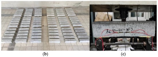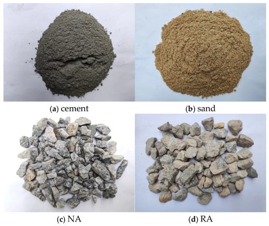 The study primarily conducted experiments on two types of concrete: normal concrete (NC) and recycled aggregate concrete (RAC). The ordinary Portland cement was provided by Guangzhou Shijing Cement Company, with a strength grade of 42.5R, as shown in Figure 1a. The fine aggregate and natural coarse aggregate were provided by Guangzhou Huaji Building Materials Company. The fine aggregate, river sand, is depicted in Figure 1b. Its apparent density is 2643 kg/m3, its bulk density is 1435 kg/m3, and the fineness modulus is 2.36. The natural coarse aggregate (NA) is crushed stone with a particle size ranging from 5 mm to 31.5 mm, as shown in Figure 1c. The apparent density is 2750 kg/m3, the water absorption is 1.3%, and the moisture content is 1.02%. Figure 1d shows the recycled coarse aggregate (RA), which is sourced from construction and demolition waste, primarily consisting of recycled concrete. No specific treatment was applied to remove adhered mortar, which may contribute to the variability in the aggregate’s properties. Its apparent density is 2745 kg/m3, its water absorption is 4.73%, its moisture content is 2.56%, and its diameter ranges from 5 mm to 31.5 mm. Tap water from the materials laboratory was used for concrete mixing and curing.