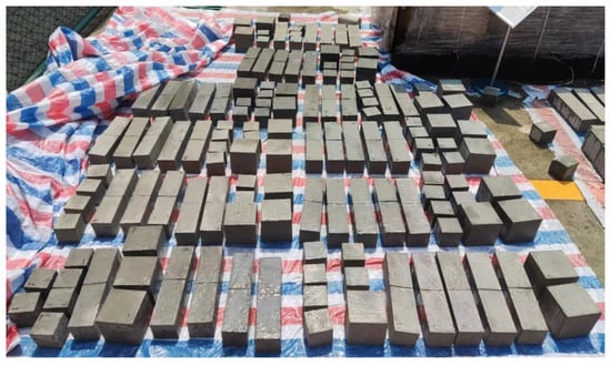 The curing method adopted for the specimens was natural curing. The specimens were placed in a shaded and humid environment. A layer of plastic film was then placed over the top to maintain appropriate temperature and humidity levels for the freshly cast specimens. After 24 h of curing, the molds were removed. Subsequently, for the next 28 days, the specimens were cured by watering at least twice a day to ensure they achieved the required curing temperature and humidity. The specimen curing site is shown in Figure 2.