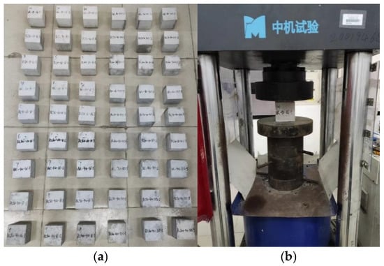 Cube compressive strength test: (a) the specimens; (b) loading.