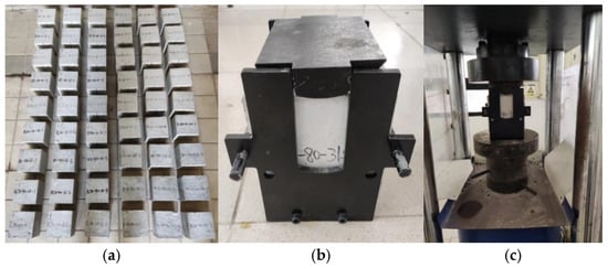 A HJW100 forced mixer with a single horizontal shaft was used for concrete mixing. During the mixing process, the initial step involved pre-wetting the dry mixer with tap water to prevent it from absorbing water. Then, according to the mix proportion (Table 1), cement, sand, and coarse aggregates were added to the mixer simultaneously for a dry mixing duration of 30 s. Subsequently, half of the required water amount was added and mixed for 60 s. Finally, the remaining water was added, and mixing continued for another 120 s. This procedure ensured the uniformity of the mixed materials. The mixture was then poured into the corresponding molds and placed on a vibrating table for compaction.