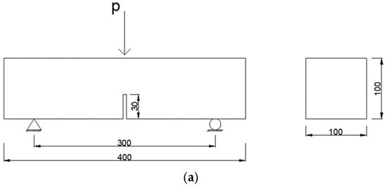 According to the standard GBT 50081-2019 [], compressive strength tests were conducted using 100 × 100 × 100 mm3 cubic specimens, while split tensile strength tests were conducted using cubic specimens with dimensions of 150 × 150 × 150 mm3. Three specimens were cast for each type of concrete for both compressive and split tensile strength tests. For the fracture test, the three-point bending method was employed following the standard DLT5332-2005 []. This involved using notched beam specimens with dimensions of 100 mm × 100 mm × 400 mm, with five specimens cast for each group. The dimensions and quantities of specimens used in this study are summarized in Table 2.