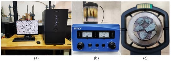 Microscopic test: (a) SEM; (b) ion sputtering machine; (c) specimen after gold coating.