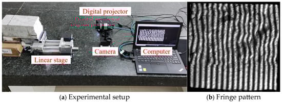 Figure 7a shows the fringe projection 3D measurement system. The system consists of a DLP projector (Ricoh, rw1120est, Tokyo, Japan) with a resolution of 1280 × 800 pixels, a 12-bit CMOS camera (IDS, 3370, Obersulm, Germany), a computer (ThinkPad, X11, Beijing, China), and a linear translation stage. The projector is used to project computer-generated sinusoidal fringe patterns, while the camera captures the distorted fringe patterns. All these images are recorded by the computer. The camera optical axis was set perpendicular to the calibration plane, the distance between the camera and the calibration plane at Z = 0 was approximately 1000 mm, and the angle between the projector optical axis and the camera optical axis ranged from 20 to 40 degrees. Additionally, during the experiment, the grayscale of the projected sinusoidal fringe patterns was adjusted within the range of 50 to 250 to ensure a good linear response of the projection-acquisition system. Figure 7b shows one of the phase-shifting fringes. The measurement area was about 100 × 100 mm2, corresponding to approximately 1500 pixels × 1500 pixels, resulting in a dense point cloud with a scanning interval of 0.067 mm/pixel for each concrete fracture surface. Figure 7c displays the reconstructed concrete surface by using fringe projection technology.