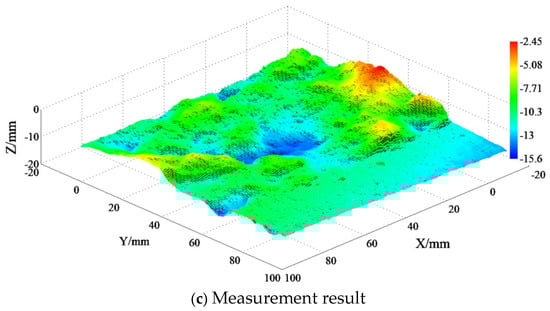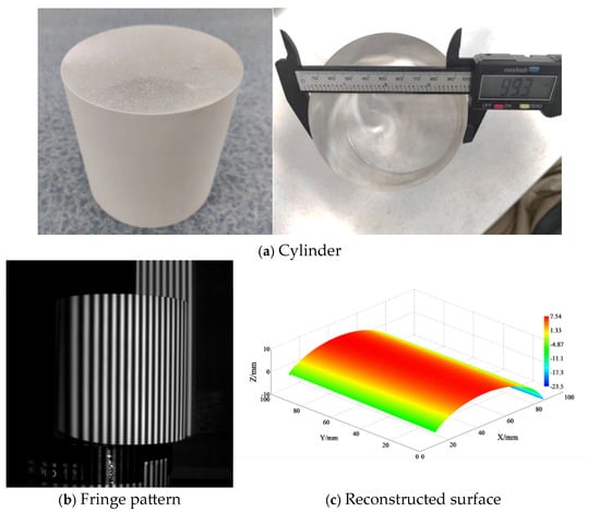 The accuracy of the measurement system was determined by measuring a standard cylinder. As shown in Figure 8a, the diameter of the standard cylinder is 99.3 mm. Figure 8b is one of the fringe patterns, and Figure 8c is the reconstructed surface. The obtained point cloud data were subjected to least squares fitting to obtain a cylindrical fitting diameter of approximately 98.67 mm, with a relative error of less than 1%. Therefore, it fully meets the accuracy requirements for measuring concrete fracture surfaces, as the minimum aggregate size of concrete sections is in the millimeter range.