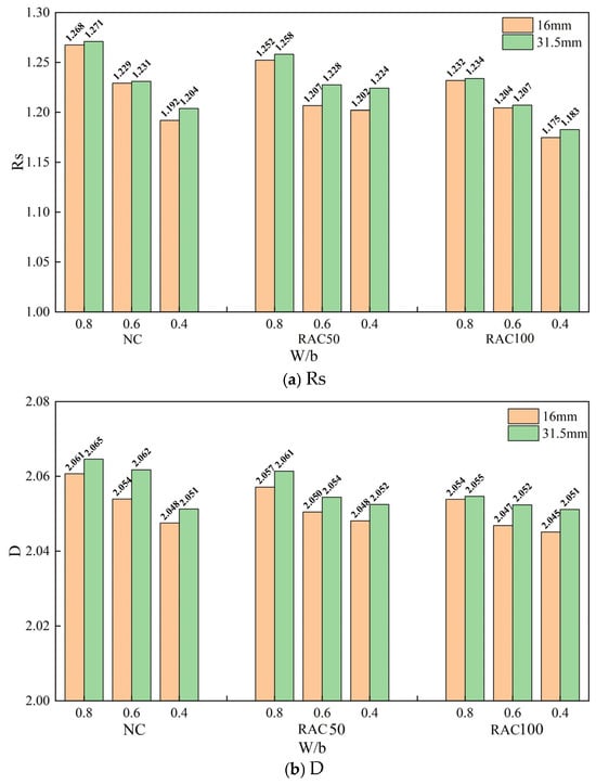 The results in Figure 13 also indicate that, for a w/b ratio of 0.8, when the replacement rate of recycled aggregate is 0%, 50%, and 100%, the roughness Rs of the specimens with a maximum aggregate size of 31.5 mm is respectively 0.27%, 0.47%, and 0.16% higher than that of specimens with a maximum aggregate size of 16 mm. Meanwhile, the fractal dimension D-2, , is 0.66%, 10.09%, and 4.27% higher, respectively. Similarly, for a w/b ratio of 0.6, the Rs values are 0.14%, 1.7%, and 0.22% higher, and are 8.1%, 10.69%, and 10.27% higher, respectively. In the case of a w/b ratio of 0.4, the Rs values are 0.99%, 1.81%, and 0.68% higher, and are 8.68%, 7.94%, and 9.68% higher, respectively.