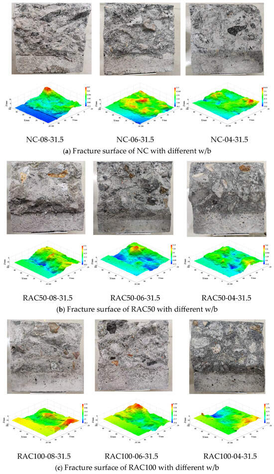 Figure 10a–c depict the fracture surface photographs and corresponding 3D reconstructions of NC, RAC50, and RAC100 with a maximum particle size of 31.5 mm, respectively. It can be observed that, regardless of the replacement ratio of RA, when w/b is 0.8, there is greater occurrence of aggregate debonding on the fracture surface, indicating that the fracture path mainly develops along the aggregate edges, while occurrences of aggregate fracture are relatively rare. Conversely, when the w/b ratio is 0.4, there is a significant increase in occurrences of aggregate fracture on the fracture surface, indicating that more cracks propagate through the aggregates. Moreover, from the corresponding 3D reconstructed surfaces, the changes in fracture surface are more pronounced at a w/b of 0.8 compared to 0.4, resulting in a rougher surface. This is mainly attributed to the reduction in strength of the hydration products in the interface at higher w/b ratios, making cracks more likely to originate and propagate in the interface region.