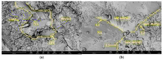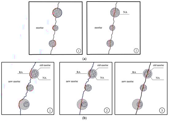 Figure 11a,b present the microstructures of NC and RAC observed through scanning electron microscopy (SEM), respectively. The old mortar refers to the mortar in the recycled aggregate, which can be seen in the part labeled as ‘old mortar’ in Figure 11b. Its structure is relatively rough, with some cracks and partially detached particles on the surface. The area labeled as ‘new mortar’ in the figure appears to have a more compact structure and shows characteristics of fresh cement hydration products, similar to the mortar shown in Figure 11a. The microstructure of NC mainly consists of natural aggregates (NA), cement mortar, and the interface transition zone (ITZ) between them. While the microstructure of RAC is relatively complex, with multiple interfaces: the ITZ between NA and old mortar (L1), the ITZ between old and new mortar (L2), and the ITZ between NA and new mortar (L3). This complexity results in the possibility of more intricate fracture paths in recycled aggregate concrete []. Figure 12a,b respectively present two potential fracture paths in NC and three potential fracture paths in RAC. In Figure 12a, path ① represents the dominant fracture path when a higher w/b ratio (with lower mortar performance) is used. In this case, cracks propagate along the interface, leading to higher surface roughness. Path ② in Figure 12a corresponds to the dominant fracture path when a lower w/b ratio (with higher mortar performance) is used. Here, cracks pass through the natural aggregate, resulting in a smoother fracture surface.