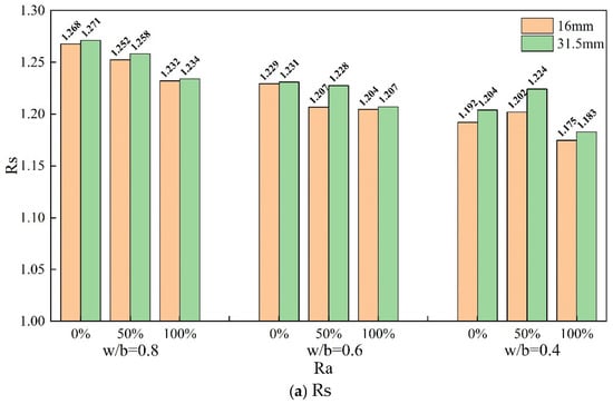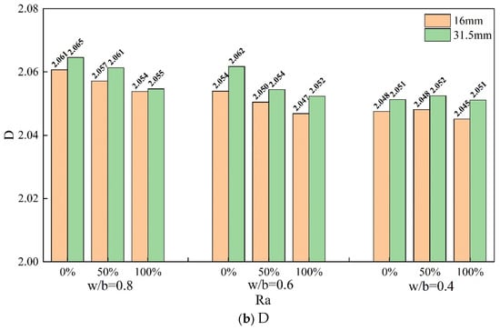 Figure 13a,b respectively illustrate the surface roughness Rs and fractal dimension D of concrete specimens with different recycled aggregate replacement rates (Ra). The results indicate that regardless of the particle size, when the w/b is 0.8 or 0.6, the surface roughness Rs and fractal dimension D decrease with an increase in the replacement rate of recycled aggregate. When the recycled aggregate replacement rate increases from 0% to 100% with a maximum aggregate size of 16 mm, the surface roughness Rs decreases by 2.81% and 2.02% for w/b ratios of 0.8 and 0.6, respectively, while the fractal dimension D-2, , decreases by 16.79% and 10.89%, respectively. Correspondingly, for a maximum aggregate size of 31.5 mm, the surface roughness Rs decreases by 2.92% and 1.94%, while decreases by 13.66% and 8.74%, respectively, for w/b ratios of 0.8 and 0.6. As shown in Figure 10, for w/b ratios of 0.8 and 0.6, when the recycled aggregate replacement rate is 0%, the predominant fracture path is along the edges of natural aggregates, leading to a significant surface depth difference. When the recycled aggregate replacement rate is 50%, the natural aggregates on the interface mainly undergo debonding, while some recycled aggregates fracture, resulting in a flatter surface. With an increase in the recycled aggregate content to 100%, more fractures occur in the recycled aggregates, resulting in a smoother variation in surface.