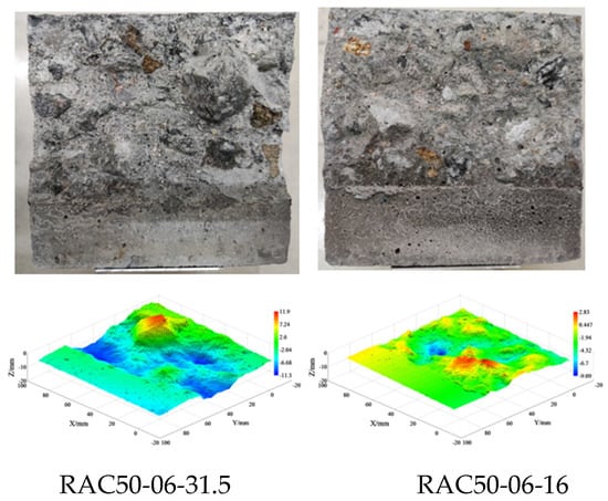 Overall, regardless of the w/b ratio or the replacement rate of recycled aggregate, the surface roughness of specimens with a maximum aggregate size of 31.5 mm is slightly greater than that of specimens with 16 mm, as shown in Figure 14. This is primarily because the interface changes generated when cracks pass through the edges of larger aggregates are more pronounced than those generated when passing through the edges of smaller aggregates [].