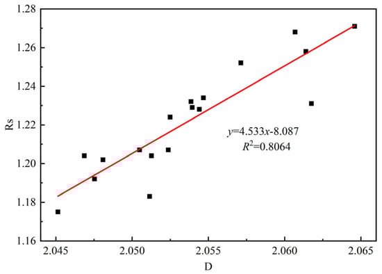 Figure 15 shows the relationship between the fracture surface roughness and fractal dimension for recycled concrete. It indicates that there is a positive correlation between the roughness Rs and the fractal dimension D of the recycled aggregate concrete fracture surface. This is because an increase in fractal dimension D indicates greater irregularity and complexity of the concrete fracture surface, leading to an increase in roughness Rs. This relationship provides a basis for analyzing concrete fracture surface metrics.