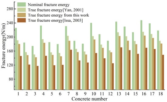 Additionally, there are two other methods for calculating the actual fracture energy. The first method, presented by Yan [], employs the following formula for calculating genuine fracture energy: