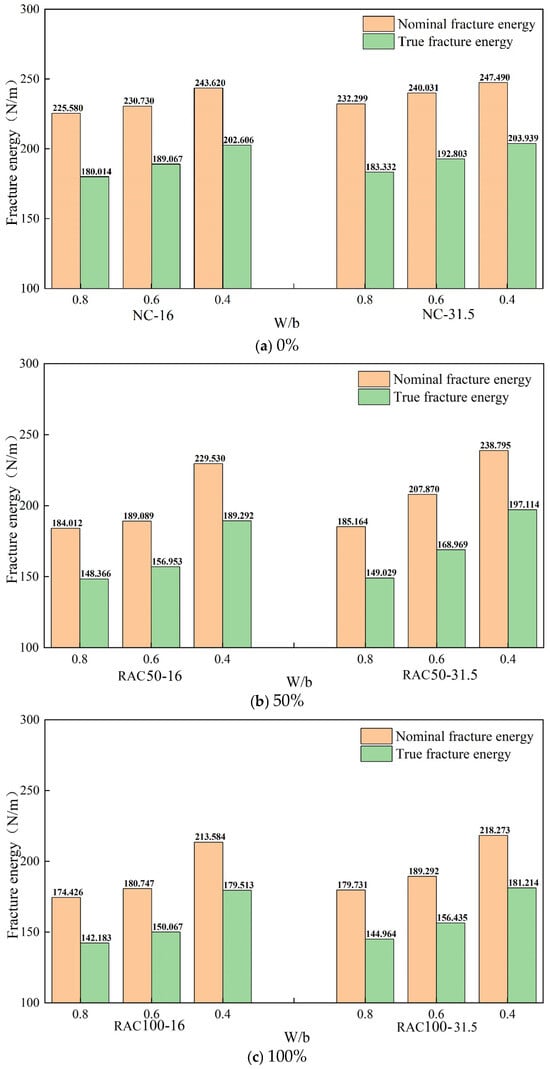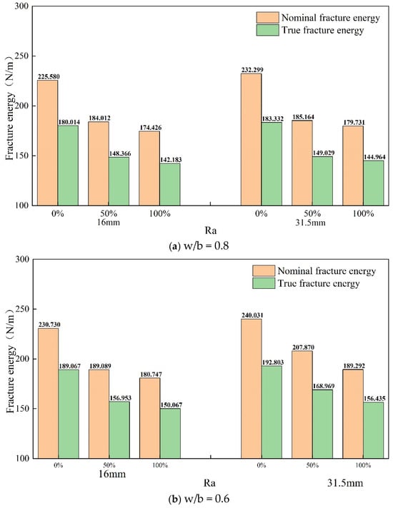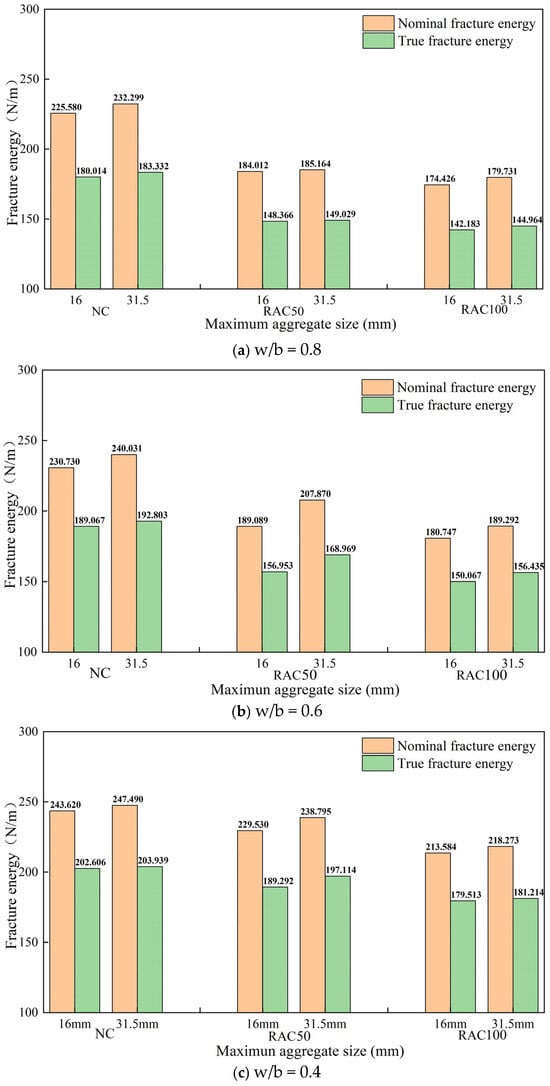 In the case of recycled aggregate concrete with a 100% replacement rate of recycled aggregates, when the w/b ratio is 0.8, 0.6, and 0.4, the nominal fracture energy for a maximum aggregate size of 16 mm is 174.426 N/m, 180.747 N/m, and 213.584 N/m, respectively, while the true fracture energy is 142.183 N/m, 150.067 N/m, and 179.513 N/m, respectively. Compared to the nominal fracture energy, the true fracture energy decreased by 18.49%, 16.97%, and 15.95%, respectively. For recycled aggregate concrete with a maximum aggregate size of 31.5 mm, the nominal fracture energy is 179.731 N/m, 189.292 N/m, and 218.273 N/m, respectively, while the true fracture energy is 144.964 N/m, 156.435 N/m, and 181.214 N/m, respectively. Compared to the nominal fracture energy, the true fracture energy decreased by 19.34%, 17.36%, and 16.98%, respectively.