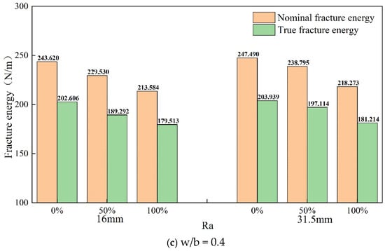 Figure 17a–c illustrate the effect of the w/b ratio on the fracture energy of concrete specimens with recycled aggregate replacement rates of 0%, 50%, and 100%, respectively. It is evident that under the condition of a 0% replacement rate of recycled aggregates, the nominal fracture energy values for a maximum aggregate size of 16 mm at w/b ratios of 0.8, 0.6, and 0.4 are 225.58 N/m, 230.73 N/m, and 243.62 N/m, respectively, and the true fracture energy values are 180.014 N/m, 189.067 N/m, and 202.606 N/m, respectively. Compared to the nominal fracture energy, the true fracture energy decreased by 20.20%, 18.06%, and 16.84%, respectively. For recycled aggregate concrete with a maximum aggregate size of 31.5 mm, the nominal fracture energy values are 232.299 N/m, 240.031 N/m, and 247.49 N/m, respectively, and the true fracture energy values are 183.332 N/m, 192.803 N/m, and 203.939 N/m, respectively. Compared to the nominal fracture energy, the true fracture energy decreased by 21.08%, 19.68%, and 17.60%, respectively.