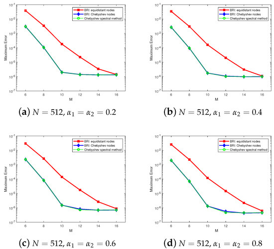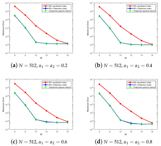 ; the corresponding computational results are shown in Figure 4. It can be seen that the spatial BRI with Chebyshev nodes can yield computational results consistent with those of the Chebyshev spectral collocation method. Moreover, the BRI can achieve a similar highly accurate numerical solution regardless of the nodal distribution, even for equidistant nodes.