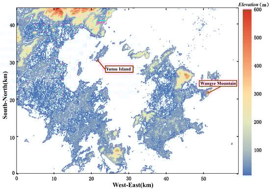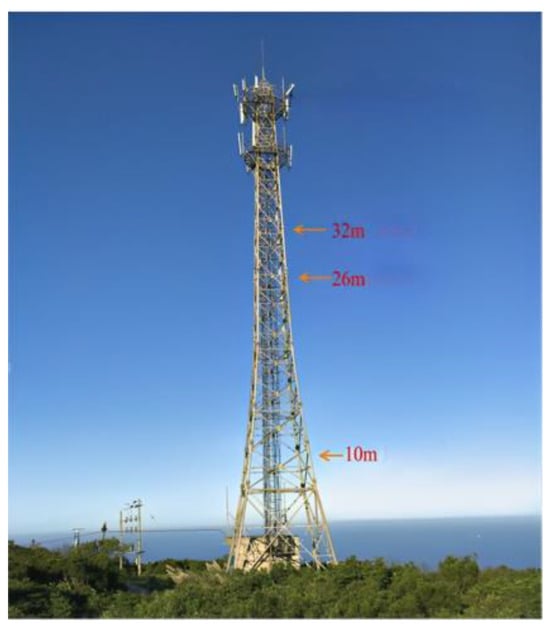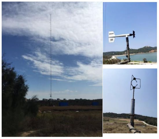The data presented in this research are based on wind field measurements taken at two locations in Pingtan County, Fujian Province, China, as shown in Figure 1. Fujian Province is located in the southeastern coastal area of China and is rich in wind resources because of its geographical location and climate conditions. Numerous wind farms have been constructed for wind power generation. However, extreme wind events may occur, such as typhoons, which may influence the safety and stability of wind turbines [,]. In this research, wind field measurements were taken at two stations, as shown in Figure 1. Station 1 is located on Wangye Mountain in Pingtan County (WM Station), and Station 2 is located on Yutou Island in Pingtan County (YI Station) in Fujian Province, China, as indicated in Figure 2 and Figure 3 respectively. The WM Station is located east of the Taiwan Strait and has flat terrain on the west side and an open sea on the southern and northern sides. The monsoon-dominated wind direction is north–northeast (11.25–33.75°). The YI Station is surrounded by the sea on the north side and a small forest on the east side. Three-dimensional wind speeds were recorded with 3D sonic anemometers, as indicated in Figure 3. The 3D sonic anemometers used are high-performance Wind Master Pro devices that are produced by the UK Gill Company, with a wind speed range of 0–65 m/s, an accuracy of 0.01 m/s, a wind direction range of 0–359°, and a resolution of 0.1°. A 10 Hz output frequency is used on site, which means that one set of instantaneous 3D wind speeds is recorded every 0.1 s. The ultrasonic anemometers can work at temperatures ranging from −40 to +70 °C, and a small weather station was installed at a height of 10 m to monitor the working temperatures of the ultrasonic anemometers with a thermometer accuracy of 0.01 °C. Identification codes are generated automatically to be used as a reference for data quality control. When the data are unstable or out of range, they are flagged as 0 in the recorded data. The bad or invalid data points are eliminated and then reconstructed using the multiple truncation variance data control method []. For Station WM, 3D sonic anemometers were installed at heights of 10 m, 25.87 m, and 31.87 m, whereas they were installed at heights of 10 m, 80 m, and 100 m for Station YI, as shown in Figure 2 and Figure 3.