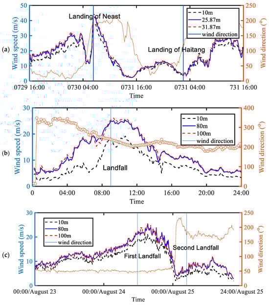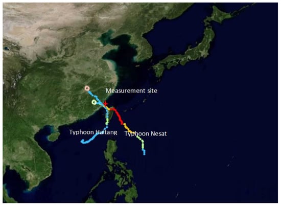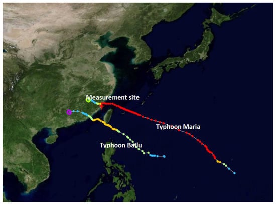 Four typhoon events were recorded from 2016 to 2019 at the two stations. Typhoons Nesat and Haitang were recorded in 2016 at the WM Station, and Typhoons Maria and Bailu were recorded at the YI Station. Detailed descriptions of the typhoon landfall times and measurement heights are provided in Table 1. The ultrasonic anemometers were installed on wind towers at heights of 10 m, 25.87 m, and 31.87 m at the WM Station and at heights of 10 m, 80 m, and 100 m at the YT Station. Typhoon Nesat made landfall in Fuqing, China, at 06:00 on July 30, 24.5 km away from the measurement site, and the maximum measured 10-min mean wind speed was 37.8 m/s. Typhoon Haitang made landfall after Typhoon Nesat within 24 h at the same position, with a maximum measured 10-min mean wind speed of 25.4 m/s. The landfall events of the two typhoons are shown in Figure 4. Typhoon Maria made landfall at Lianjiang, Fujian Province, China, at 09:10 on July 11, with a maximum wind speed of 42 m/s in the center; wind speeds were recorded at the measurement site. Typhoon Bailu made landfall in Dongshan County in Fujian Province at 7:25 am on 25 August 2019, with a wind speed of approximately 25 m/s near the center. Even though the measurement site is located 278 km away from the center of the landfall location, the maximum 10-min wind speed approached 25.69 m/s because of the low pressure. The landfall events for Typhoons Maria and Bailu are shown in Figure 5.