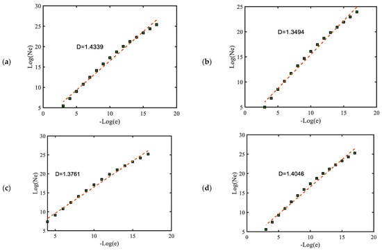 Fractal theory, introduced by Mandelbrot, provides a framework for understanding complexity through items that exhibit self-similarity both locally and globally. The fractal dimension is a key metric for quantifying this complexity. The fractal dimension can reflect the changes in the topological measurements of a physical set across different scales []. Given that wind is one of the most complex turbulent phenomena in nature, analyzing its fractal dimension offers a quantitative way to assess the irregularity of wind time series, making it a valuable tool for studying turbulent behaviors, especially for typhoon wind speeds, which have been proven to have more obvious turbulent characteristics. Currently, various methods have been employed to estimate fractal dimensions, including power spectrum analysis, wavelet transforms, root mean square calculations, R/S analysis, box counting, and variance methods [,,]. Among these methods, the box-counting method is particularly popular for fractal analyses of time series because of its simplicity and ease of automation. The box-counting method involves placing the time series in grids and then calculating the number of nonoverlapping boxes that can cover all of the time series. Mathematically, this can be described as follows: