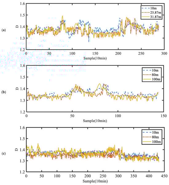Fractals are proposed to describe self-similarity at different sizes and scales. The fractal dimension can be a noninteger that measures the irregularities of a set at different scales. A higher fractal dimension indicates a more complex and rougher shape [,,]. As a type of turbulent flow, wind speeds can be described by a fractal function, and feedback information about the wind field under near-ground conditions can be extracted by the fractal method [,]. The monofractal or multifractal characteristics present information on such stochastic processes, and therefore have been applied to wind speed analyses in numerous studies. On the basis of wind speed data at three wind speeds, Chang [] reported that the values of the annually averaged fractal dimensions range between 1.61 and 1.66 and are negatively related to the wind speed. However, Fortuna [] reported that the wind speeds measured in the USA and Italy exhibit characteristics of low-dimensional chaos, with fractal dimensions of 1.19 and 1.41, respectively. Moreover, on the basis of fractal theory, different types of wind speeds, such as monsoon [,] and typhoon [] wind speeds, are investigated at the 10-min, daily, hourly, and monthly time scales. In Liang’s research [], anti-persistence in wind speed time series was found during strong winds on the basis of 10 min of wind speed data, and the fractal dimensions were proven to be different at different altitudes. However, on the basis of monthly wind speeds, fractal dimensions between 1 and 1.5 have been calculated, indicating persistence characteristics []. Shu [] investigated the influence of terrain on the fractal dimensions and concluded that more complex terrain results in larger fractal dimensions and therefore greater complexity in wind speed fluctuations.