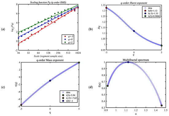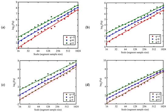 For the long-term relationship, , where s is the considered scale and is the qth-order fluctuation, negative q values represent increases in small fluctuations, and positive q values indicate increases in large fluctuations. A power-law change, namely, increases with the increasing power of s and can determine if there is a long-term correlation in the signal. With the use of a double logarithmic plot, when linearly increases with ln (s), the slope can be calculated as the generalized Hurst exponent of the recorded time series, indicating scale dependence, which is characteristic of multifractality.