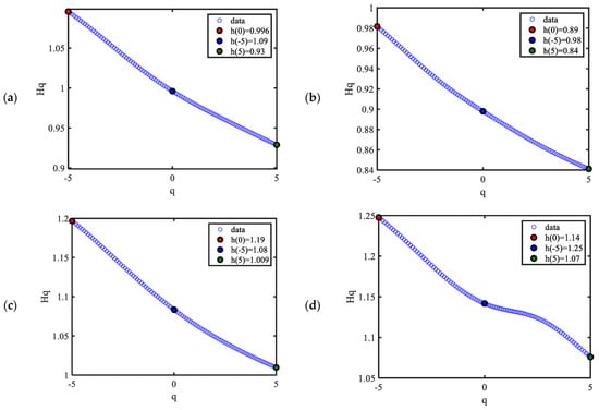 Generalized Hurst Exponents based on typhoon wind speeds (a) Nesat, (b) Haitang, (c) Maria, and (d) Bailu.