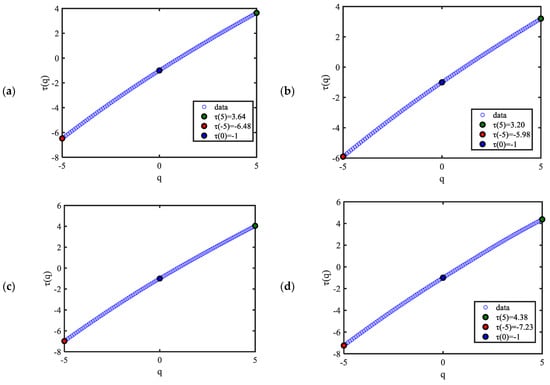 The dependence of on q or the generalized Hurst exponent on q indicates that in monofractal calculations, the local trend of each segment is obtained from fitting the variance calculation of each segment. Therefore, the trend is unchanged when the scaling is unchanged, namely, is independent of q. However, for time series with multifractal features, the dependence of h on q is caused by fluctuations at large scales. For a large positive q value, the least squares fitting result has a large deviation, so the variance is large and the h(q) value is small, whereas for a negative q value, the variance is small and the value is large. In general, for monofractal datasets, all scales have an exponent, whereas for multifractal time series, monotonically decreases with increasing q.