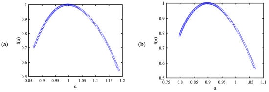 For a change in the q value from a negative value to a positive value, if is almost constant, then the relationship between the qth-order mass exponents and q is a straight line and the width of the multifractal spectrum is close to 0, indicating that the time dataset has single fractal characteristics. However, if H(q) changes significantly, the qth-order mass indices and q have nonlinear relationships, and the signal has multifractal characteristics. For the skewness r, when r = 0, the fractal spectrum is symmetric. When r > 1, it is classified as a right spectrum, where the fractal exponent describes the scale of the small fluctuations. When r < 1, it is a left spectrum, where the fractal exponent describes the scale of the large fluctuations. For the above three parameters, the multifractals of the described signal are more complex when and W are larger and r > 1.