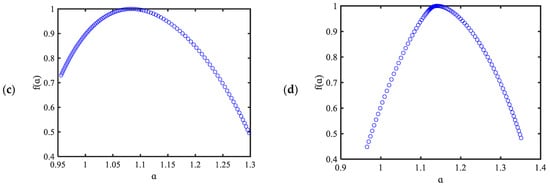 Figure 11c shows the qth-order mass exponent with vs. q. Research has shown that [,,] if varies linearly with a change in q, the time series can be considered monofractal, whereas it is multifractal if it shows a nonlinear tendency. Notably, both the change in and can provide evidence of a multifractal sequence. In Kantelhardt’s [] research, the relationship between the two parameters can be expressed as by considering a stationary positive and normalized sequence, substituting its simplified version of the variance and standard fluctuation analysis into (6) and comparing it with the box probability for the standard multifractal formalism for the normalized series. Figure 11c shows that nonlinear variations can be found in the qth-order mass exponent, indicating multifractal characteristics of the considered time series. Figure 11d shows the multifractal spectrum against ɑ with a nonlinear varying tendency, indicating the multifractal characteristics of the wind speed time series.