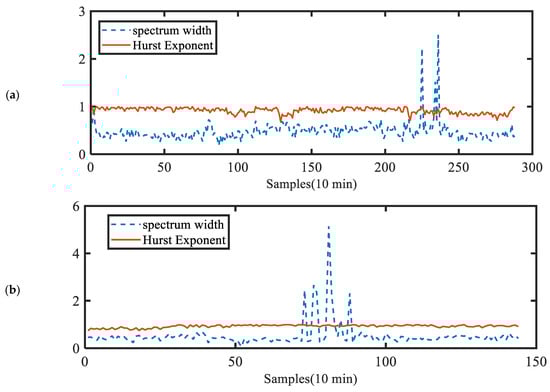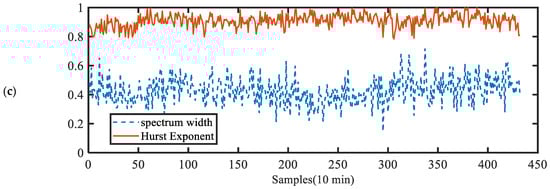 In Figure 16, the spectral widths of the four typhoons are presented. As indicated, the spectral widths for Typhoons Nesat, Haitang, and Maria clearly have large peak values, with values of 2.6 and 5, respectively, whereas the spectral widths vary from 0.2 to 0.6 for Typhoon Bailu. As indicated, peak values may occur during the landfall for typhoons. Therefore, peak values are induced by the occurrence of landfall for typhoons. However, owing to the long distance between the landfall location of Typhoon Bailu and the measurement site, there is no obvious peak value, as shown in Figure 16c. A large spectral width always indicates greater multifractality, guaranteeing that for the whole typhoon event, the wind speeds tend to be most complex and unpredictable near the typhoon’s center.
