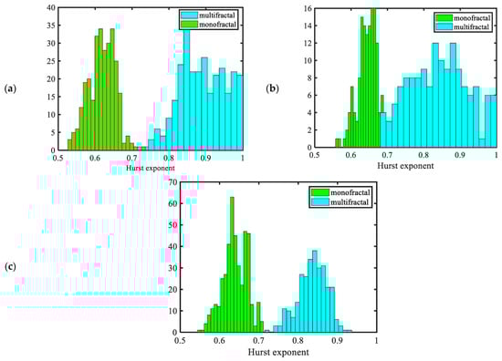 Figure 17 compares the Hurst exponents calculated by monofractal analysis and the MFDFA. In general, the monofractal Hurst exponents for the four typhoons range from 0.5 to 0.7, whereas they range between 0.7 and 1 according to the MFDFA. These values agree with the analysis results of the reference [] mean wind speeds that were measured by 110 weather stations. The MFDFA indicates that the original series have persistence, since the values are generally greater than 0.5.