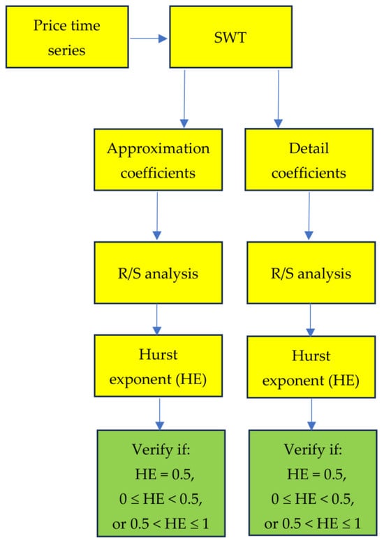 The flow chart of the proposed approach for the analysis of crude oil prices is shown in Figure 1. First, the price time series are decomposed by SWT to obtain details and approximation coefficients used to represent short and long (trend) movements (oscillations) in the original data. Then, the R/S analysis is applied to each category of coefficients to estimate the Hurst exponent (HE) and to reveal how fractals affect short and long oscillations. Therefore, a detailed analysis of nonlinear dynamics in price data can be achieved by applying the R/S in the SWT domain. Finally, the obtained Hurst exponent from detail and approximation coefficients can be interpreted. Specifically, the computed value of HE should be compared to 0.5. For instance, if HE is equal to 0.5, then price series obey a random process and cannot be predicted. If HE is less than 0.5, then price series are anti-persistent. In this regard, a decrease (increase) in price is most likely followed by an increase (decrease) in price. However, if HE is larger than 0.5, then price series are persistent. Accordingly, a decrease (increase) in price is most likely followed by a decrease (increase) in price. The SWT and R/S analyses are described next.