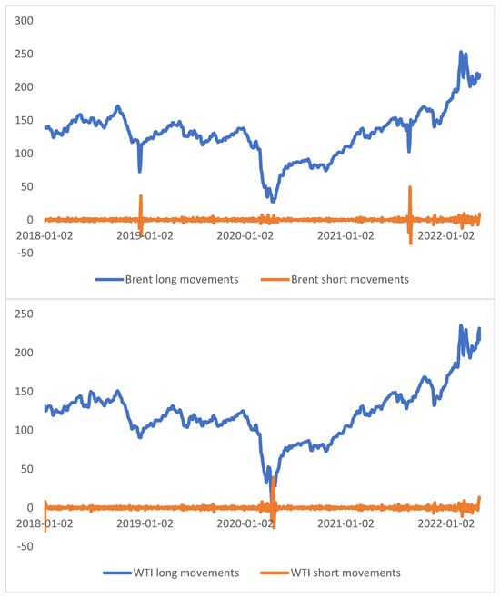 Representations of short and long movements obtained by SWT in prices of Brent and WTI on the full sample.