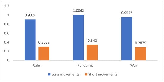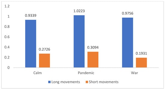 In addition, the rate of change in the Hurst exponent of long movements from the pandemic to the Russia-Ukraine war is −5% for both Brent and WTI. This finding suggests that the effect of the war on the self-similarity of long movements is similar across prices of Brent and WTI. In addition, the rate of change in the Hurst exponent in price short movements from the pandemic to the war period is −38% for Brent and −16% for WTI. Hence, the effect of the war is stronger on short movements than on long movements. Furthermore, the war period strongly affected self-similarity in short movements of Brent compared to short movements in WTI: −38% versus −16%. It is worth mentioning that the rate of change in the Hurst exponent is always negative during the war period.