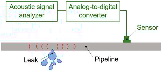 Of the wide variety of leak detection methods, the acoustic method can be distinguished, which is widely used to search for defects in water supply systems, heating networks, gas pipelines, etc. It is based on the registration of acoustic waves that propagate through the pipeline. The principle of operation of such a leak monitoring system is shown in Figure 1. Accelerometers can be used as acoustic sensors, which are mounted on the outer surface of the pipeline. Analog signals from the sensors are converted to digital form and analyzed using various methods.