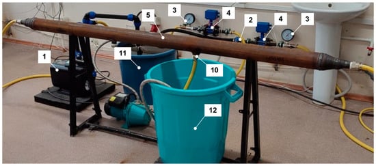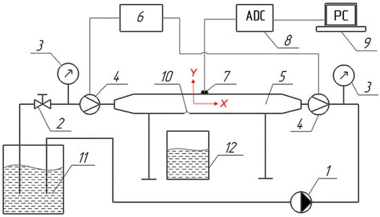 The scheme of the experimental setup: 1—pumping station MAC550 (LEO, China); 2—valve, 3—manometer, 4—electromagnetic flow meter ERSV-410 (Vzljot, Russia); 5—pipeline; 6—measuring unit of flow meter TSRV-022 (Vzljot, Russia); 7—vibration acceleration sensor AP2038P-1000 (GlobalTest, Russia); 8—analog-to-digital converter ZET 030 (ZETLAB, Russia); 9—PC; 10—defect; 11—water storage capacity; 12—drain container.